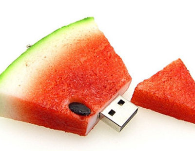 También tenemos a los USB con forma de objetos poco comunes que podrían ir desde comida hasta cosas que encontramos en nuestra casa. Ejemplo de esto son estos dos modelos que encontré. El de forma de sandía es súper femenino y es perfecto para coleccionar, además, vean el detalle de hacerlo lo más real posible, ¡muy encantador!