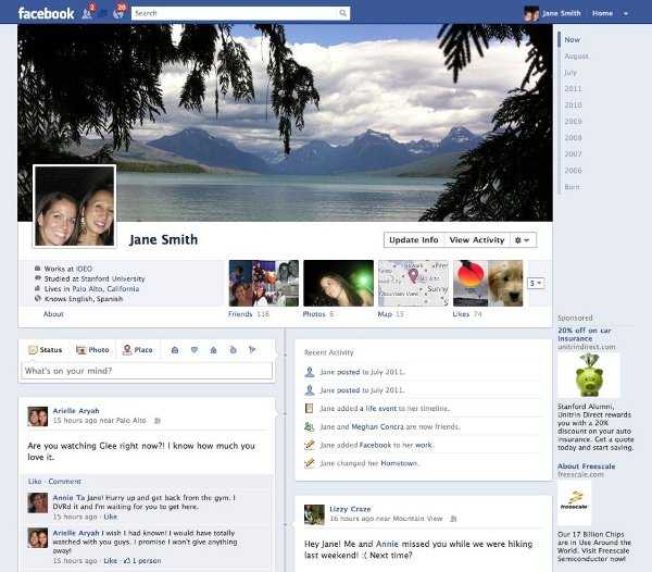 Estoy segura de que más de una habrá hecho una línea de tiempo en el colegio. Consistía en trazar una línea e ir colocando los eventos más importante por fechas. Timeline de Facebook funciona de la misma manera, pero verticalmente. Lo más antiguo se encuentra en la parte más baja del perfil y lo más actual lo podemos ver apenas ingresamos al perfil de una determinada persona.